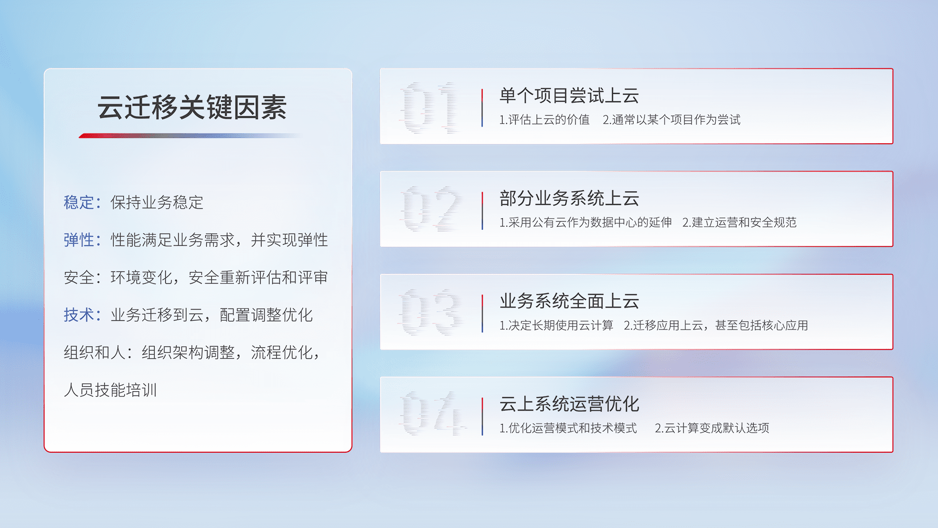 结合实际业务,,,从规划设计、、、、云平台选型、、云原生改造、、、、数据迁移、、、集成交付,,迁移全过程为客户识别最佳上云路径,,,做好风险识别管理,,,设计网络架构、、、、身份权限、、、、安全审计合规、、、、操作审计、、、日志审计、、、监控告警策略、、、、多站点容灾设计等,,,,对云上基础设施进行整体规划,,提升IT治理水平,,,,以满足弹性、、高可用、、、高性能的需求。。