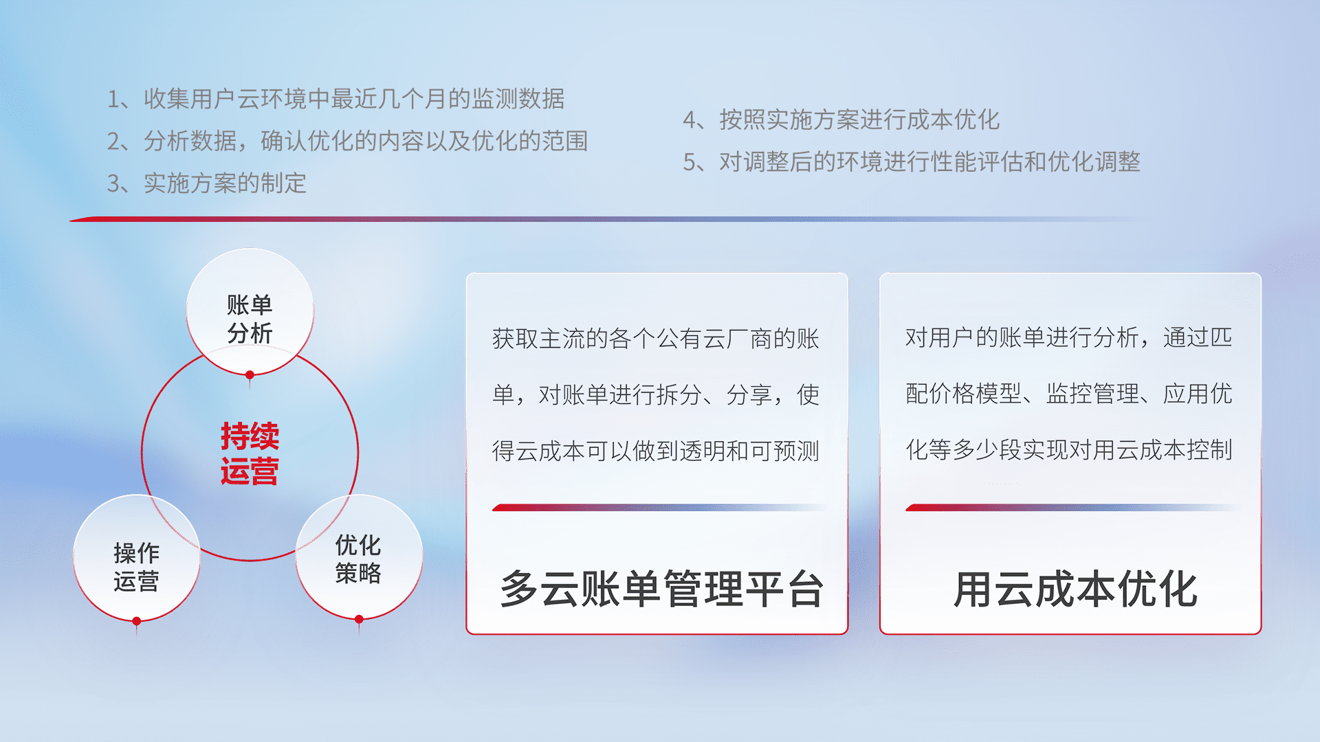 通过多云纳管,,,,以统一的资源数据模型把客户的云资源进行抽象和封装,,进而实现对多云资源的统一操作,,,,保障云资源管理的可靠性、、稳定性与可用性。。量身定制化运维内容,,,配置、、、、开发运维、、、补丁管理、、、备份、、监控、、、、认证和访问管理、、、审计和日常巡检等,,,,保障在用云过程中的可靠度,,稳定度以及高可用率。。。